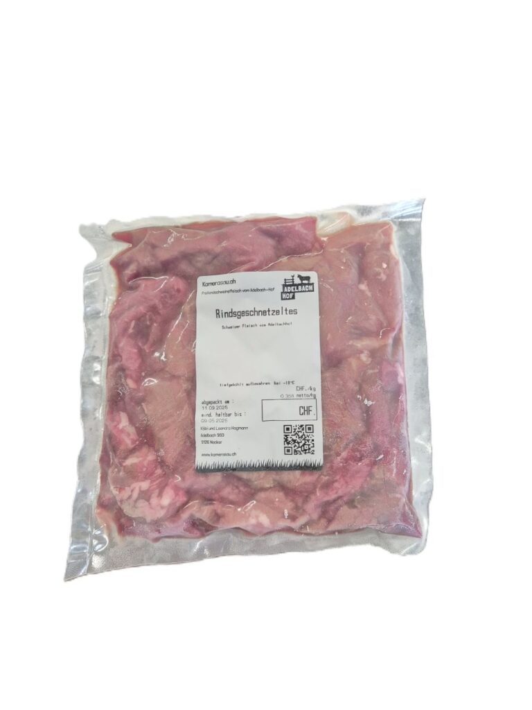Rindsgeschnetzeltes von unserem Weide-Beef wiegt etwa 400g und ist tiefgefroren, vakuumiert und beschriftet.