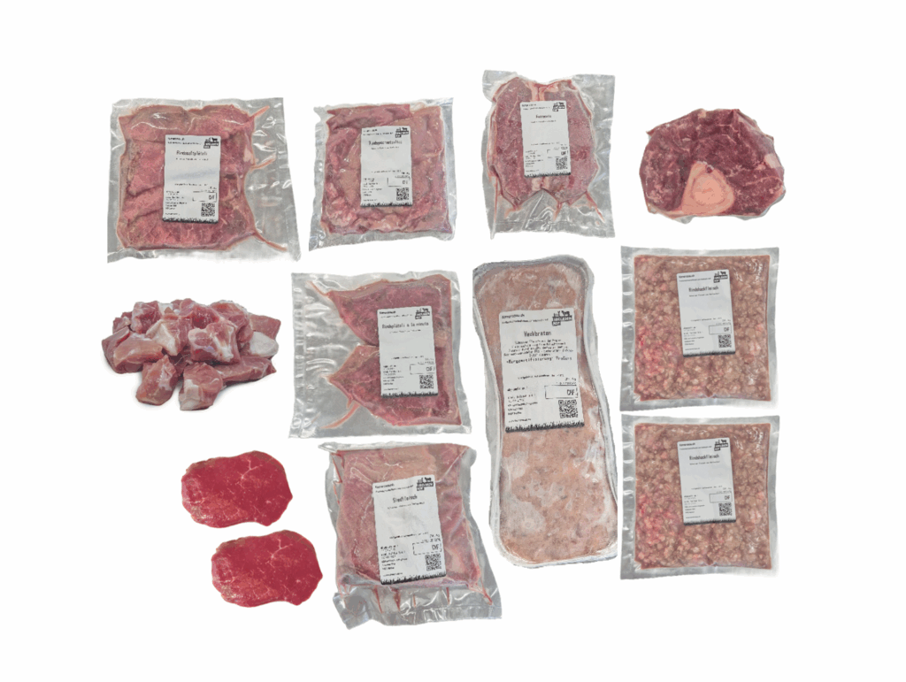 Inhalt: Gehacktes, Voressen, Geschnetzeltes, Haxen, Entrecote, Huft, Saftplätzli, Siedfleisch. Wir bemühen uns stets um ein möglichst ausgewogenes Mischpaket, je grösser das Mischpaket ist, desto ausgewogener ist es in der Zusammenstellung. Filet hat es beispielsweise nur in grossen Mischpaketen. Wünsche darfst Du uns gerne am Ende der Bestellung mitteilen. So gut wie möglich versuchen wir diese zu Berücksichtigen.